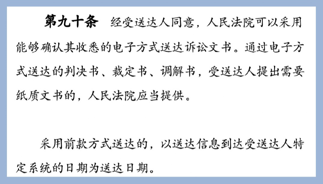 日前,曹妃甸法院向五件案件的原告送达了财产保全民事裁定书和一件案件的被告送达了准予撤诉的民事裁定书,短信直接发送到当事人预留的手机号,打开其中链接,即可查看下载扫描版PDF格式的裁判文书,文书尾部院章印迹似乎都还没干,就是如此鲜活!当事人对送达工作的提速增效赞叹不已。 ![]() 以前,电子送达只适用于传票、举证通知书等程序性司法文书,现在有了新规定,新修改的民事诉讼法第九十条明确规定将判决书、裁定书、调解书纳入电子送达适用范围。 2021年12月24日,第十三届全国人民代表大会常务委员会第三十二次会议审议通过《关于修改〈中华人民共和国民事诉讼法〉的决定》,修改后的民事诉讼法已于2022年1月1日起施行。 ![]() 电子送达裁判文书更加快捷高效,裁判文书一触即达,从审判人员推送到当事人接收短信用时仅为短短的几分钟。当事人需要纸质裁判文书的,审判人员将用法院专递再行邮寄纸质裁判文书。 ![]() 在生活节奏日益加快的今天,电子化处理事务已是趋势。民事诉讼法规定的电子送达制度,既回应了人民群众要求更优诉讼服务的呼声,又丰富了人民法院送达法律文书的方式。 |
