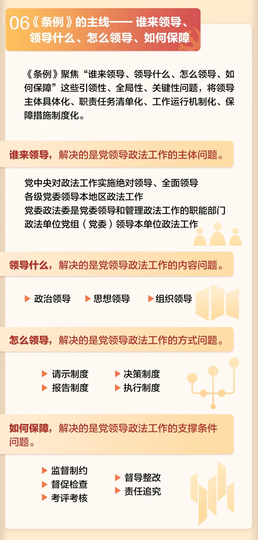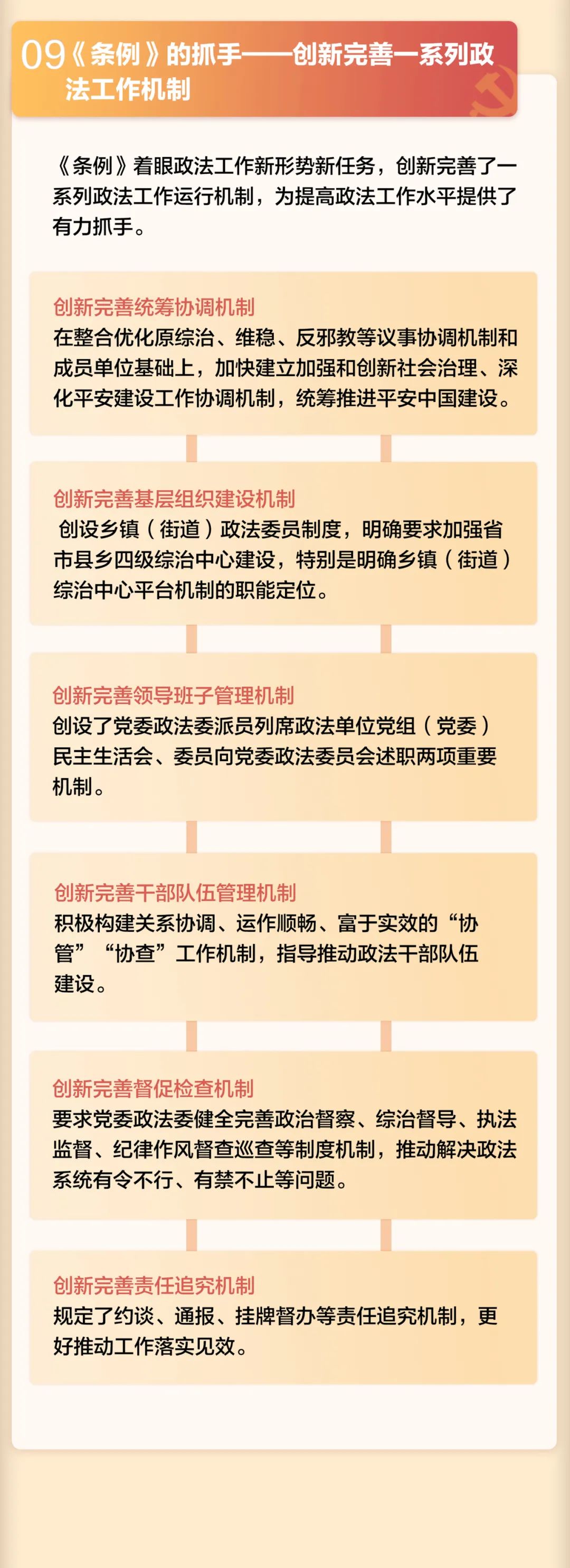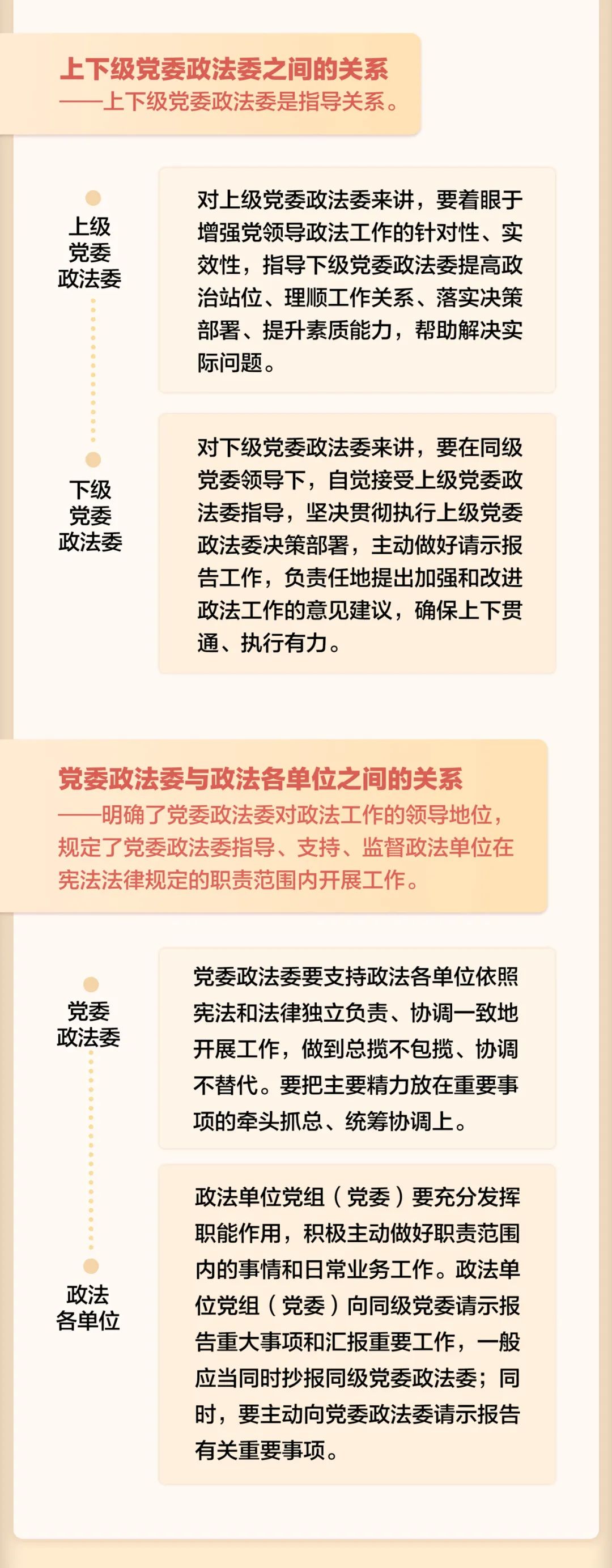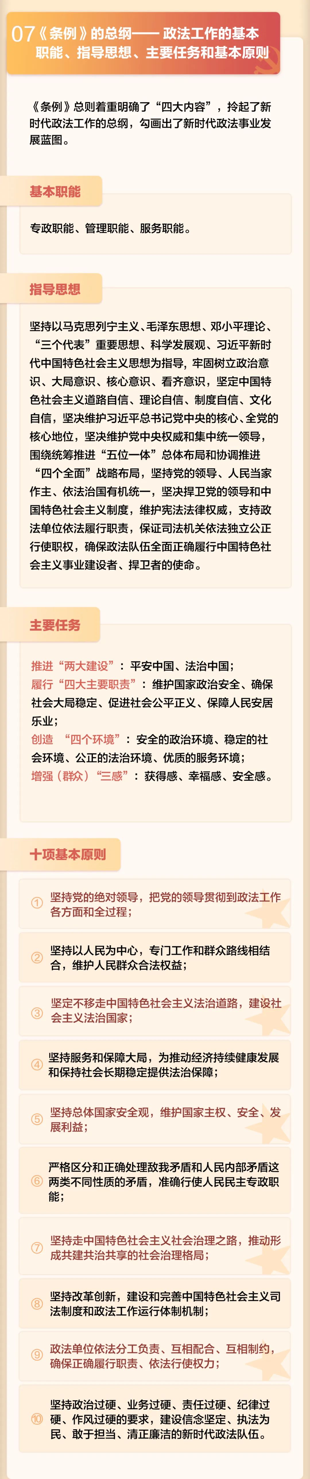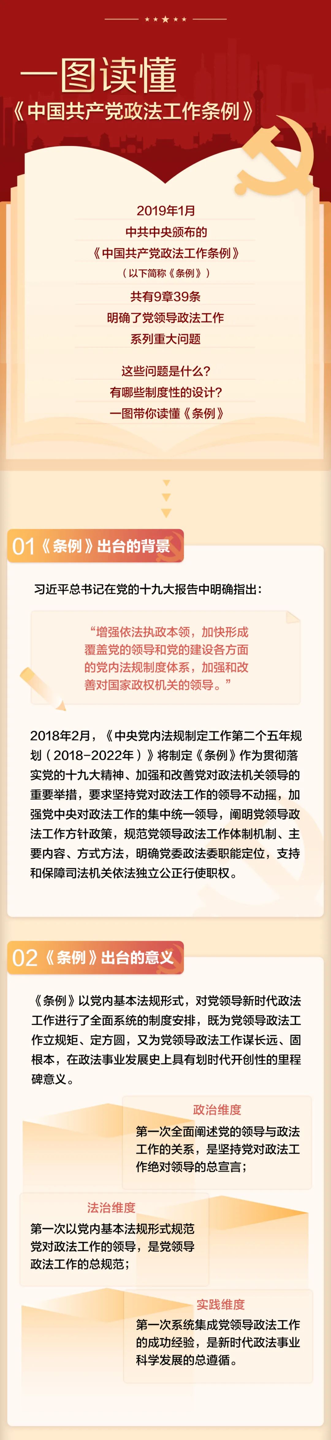 《中国共产党政法工作条例》已实施五年 作为党内基本法规 为党领导政法工作提供基本遵循 关于它你了解多少? 让我们一起重温 《中国共产党政法工作条例》 ▼▼ 中国共产党政法工作条例 第一章 总 则 第一条 为了坚持和加强党对政法工作的绝对领导,做好新时代党的政法工作,根据《中国共产党章程》、《中华人民共和国宪法》和有关法律,制定本条例。 第二条 本条例适用于中央和县级以上地方党委、党委政法委员会、政法单位党组(党委)领导和组织开展政法工作。 第三条 政法工作是党和国家工作的重要组成部分,是党领导政法单位依法履行专政职能、管理职能、服务职能的重要方式和途径。 党委政法委员会是党委领导和管理政法工作的职能部门,是实现党对政法工作领导的重要组织形式。 政法单位是党领导下从事政法工作的专门力量,主要包括审判机关、检察机关、公安机关、国家安全机关、司法行政机关等单位。 第四条 政法工作必须坚持以马克思列宁主义、毛泽东思想、邓小平理论、“三个代表”重要思想、科学发展观、习近平新时代中国特色社会主义思想为指导,牢固树立政治意识、大局意识、核心意识、看齐意识,坚定中国特色社会主义道路自信、理论自信、制度自信、文化自信,坚决维护习近平总书记党中央的核心、全党的核心地位,坚决维护党中央权威和集中统一领导,围绕统筹推进“五位一体”总体布局和协调推进“四个全面”战略布局,坚持党的领导、人民当家作主、依法治国有机统一,坚决捍卫党的领导和中国特色社会主义制度,维护宪法法律权威,支持政法单位依法履行职责,保证司法机关依法独立公正行使职权,确保政法队伍全面正确履行中国特色社会主义事业建设者、捍卫者的使命。 第五条 政法工作的主要任务是:在以习近平同志为核心的党中央坚强领导下开展工作,推进平安中国、法治中国建设,推动政法领域全面深化改革,加强过硬队伍建设,深化智能化建设,严格执法、公正司法,履行维护国家政治安全、确保社会大局稳定、促进社会公平正义、保障人民安居乐业的主要职责,创造安全的政治环境、稳定的社会环境、公正的法治环境、优质的服务环境,增强人民群众获得感、幸福感、安全感。 第六条 政法工作应当遵循以下原则: (一)坚持党的绝对领导,把党的领导贯彻到政法工作各方面和全过程; (二)坚持以人民为中心,专门工作和群众路线相结合,维护人民群众合法权益; (三)坚定不移走中国特色社会主义法治道路,建设社会主义法治国家; (四)坚持服务和保障大局,为推动经济持续健康发展和保持社会长期稳定提供法治保障; (五)坚持总体国家安全观,维护国家主权、安全、发展利益; (六)严格区分和正确处理敌我矛盾和人民内部矛盾这两类不同性质的矛盾,准确行使人民民主专政职能; (七)坚持走中国特色社会主义社会治理之路,推动形成共建共治共享的社会治理格局; (八)坚持改革创新,建设和完善中国特色社会主义司法制度和政法工作运行体制机制; (九)政法单位依法分工负责、互相配合、互相制约,确保正确履行职责、依法行使权力; (十)坚持政治过硬、业务过硬、责任过硬、纪律过硬、作风过硬的要求,建设信念坚定、执法为民、敢于担当、清正廉洁的新时代政法队伍。 第二章 党中央对政法工作的绝对领导 第七条 党中央对政法工作实施绝对领导,决定政法工作大政方针,决策部署事关政法工作全局和长远发展的重大举措,管理政法工作中央事权和由中央负责的重大事项。 第八条 党中央加强对政法工作的全面领导: (一)坚持以习近平新时代中国特色社会主义思想为指导,为政法工作坚持正确方向提供根本遵循; (二)确立政法工作的政治立场、政治方向、政治原则、政治道路,严明政治纪律和政治规矩,为政法工作科学发展提供政治保证; (三)研究部署政法工作中事关国家政治安全、社会大局稳定、社会公平正义和人民安居乐业的重大方针政策、改革措施、专项行动等重大举措; (四)加强政法系统组织建设和党风廉政建设,领导和推动建设忠诚干净担当的高素质专业化政法队伍,为政法工作提供组织保证。 第三章 地方党委对政法工作的领导 第九条 县级以上地方党委领导本地区政法工作,贯彻落实党中央关于政法工作大政方针,执行党中央以及上级党组织关于政法工作的决定、决策部署、指示等事项。 第十条 县级以上地方党委应当以贯彻党中央精神为前提,对本地区政法工作中的以下事项,落实领导责任: (一)统筹政法工作中事关维护国家安全特别是以政权安全、制度安全为核心的政治安全重要事项; (二)统筹维护社会稳定工作,及时妥善处理影响社会稳定的重要事项和突发事件; (三)统筹规划平安建设、法治建设与经济社会发展,做到同部署、同推进、同督促、同考核、同奖惩; (四)推动政法单位依法维护社会主义市场经济秩序,为经济高质量发展提供法治保障; (五)组织实施党中央关于政法改革方案,推动完善社会主义司法制度和政法工作运行体制机制; (六)完善党委领导、政府负责、社会协同、公众参与、法治保障的社会治理体制,提高社会治理社会化、法治化、智能化、专业化水平; (七)完善党委、纪检监察机关、党委政法委员会对政法单位的监督机制,保证党的路线方针政策和党中央重