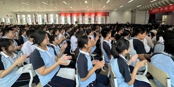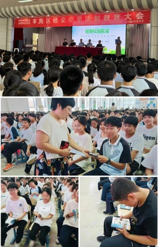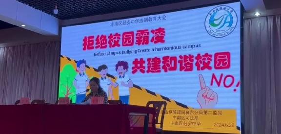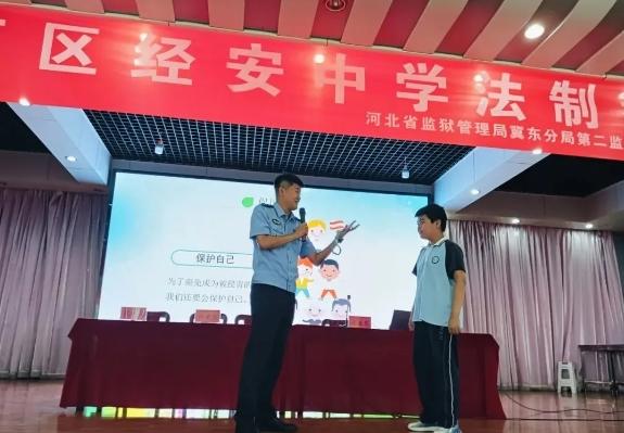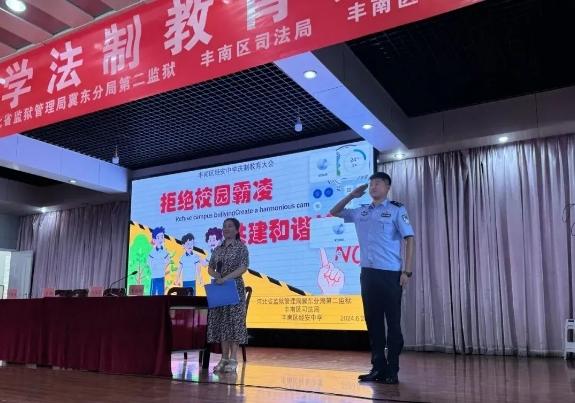 2024年6月28日下午,经安中学礼堂中一片庄严,全体师生参加了由河北省监狱管理局冀东分局第二监狱、丰南区司法局和经安中学共同组织的法治教育大会。