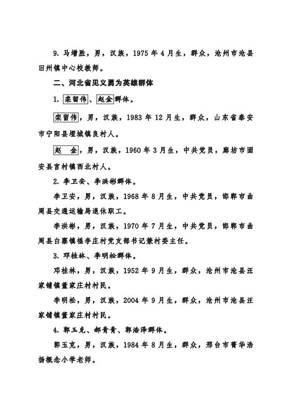 为表彰先进,弘扬见义勇为精神,推动形成新时代见义勇为社会新风尚,省政府决定授予卢仁志、毕恩厚、桑建利、武慧峰、王世纪、杨彬、杨文韬、陈明、马增胜等9人“河北省见义勇为英雄”称号;追授栾留伟、赵金群体“河北省见义勇为英雄群体”称号;授予李卫安、李洪彬群体,邓桂林、李明松群体,郭玉克、郝青青、郭浩泽群体,赖炜桢、程祥阳群体等4个群体“河北省见义勇为英雄群体”称号。