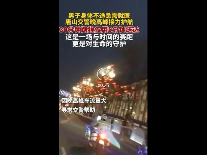 近日,唐山交警接到群众求助,一男子开车载身体突发不适的朋友前往医院遇晚高峰拥堵。接警后交警指挥中心统一调度,沿线各路口警力配合疏导,铁骑队员开道护航,原本30分钟路程仅用5分钟抵达医院,为救治赢得宝贵时间。